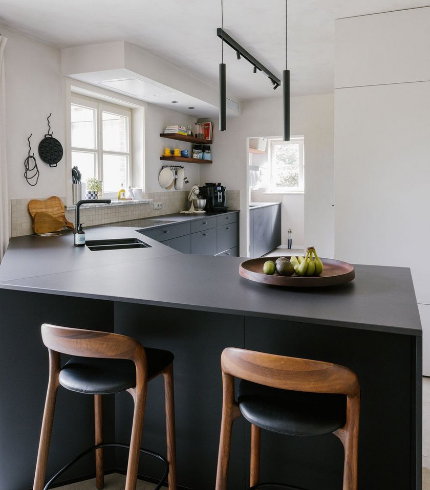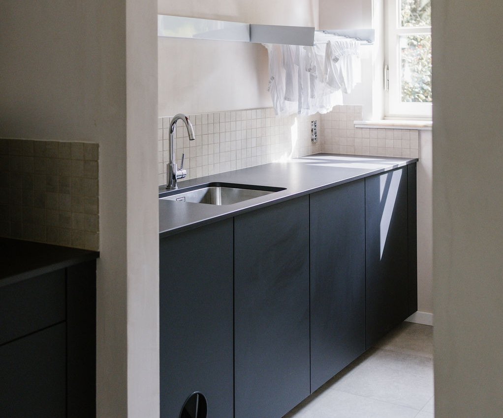 Het grote werkblad springt in het oog en is gemaakt uit duurzaam dekton®: krasvrij, hittebestendig en makkelijk in onderhoud. De bijna zwarte kleur geeft de keuken een tijdloze, luxueuze uitstraling. De rustige kolomkasten, met panelen en fijne greepjes, zorgt voor contrast en verbergt enorm veel opbergruimte. Dankzij het charmante raam achter de kookplaat en het openslaand raam naar de tuin, baadt de keuken in het licht.
