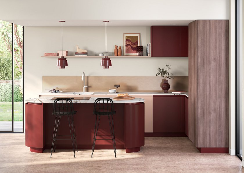 Mono Rosa onderscheidt zich door een warm en genuanceerd roze kleurenpalet. Een keuken die karakter, elegantie en gastvrijheid combineert, versterkt door materialen zoals donker hout en koperkleurige metalen accenten.