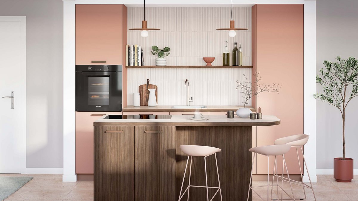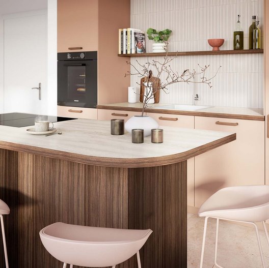 “Het werkblad is van laminaat, met een rand die past bij de houten voorkant van het kookeiland, om een harmonieus en warm geheel te creëren. De handgrepen in notenhout zorgen voor een natuurlijke toets en versterken het warme effect van het centrale kookeiland. De fronten hebben een matte anti-vingerafdrukcoating in koraal, wat persoonlijkheid geeft aan de keuken, en ook praktisch is voor het onderhoud. Een echt pluspunt voor een jong, actief koppel.”