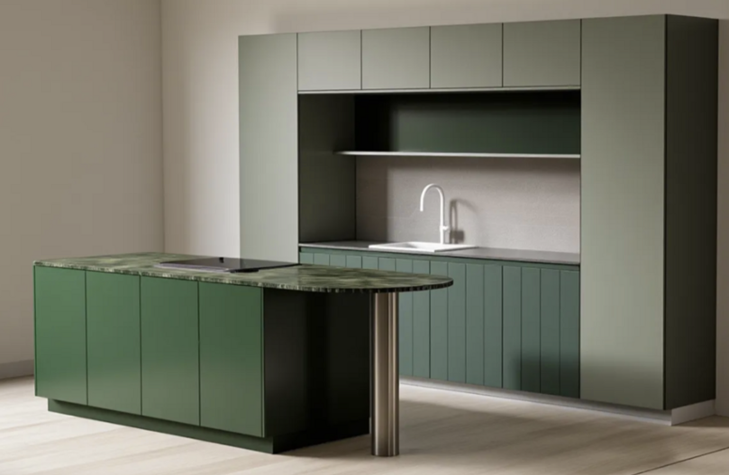 Mono Verde explore une palette plus structurée et apaisante. Le vert s'y exprime dans différentes teintes et finitions, pour une cuisine contemporaine. Associée à des matériaux soigneusement sélectionnés, elle crée un ensemble cohérent, propice à un usage quotidien fluide et confortable.