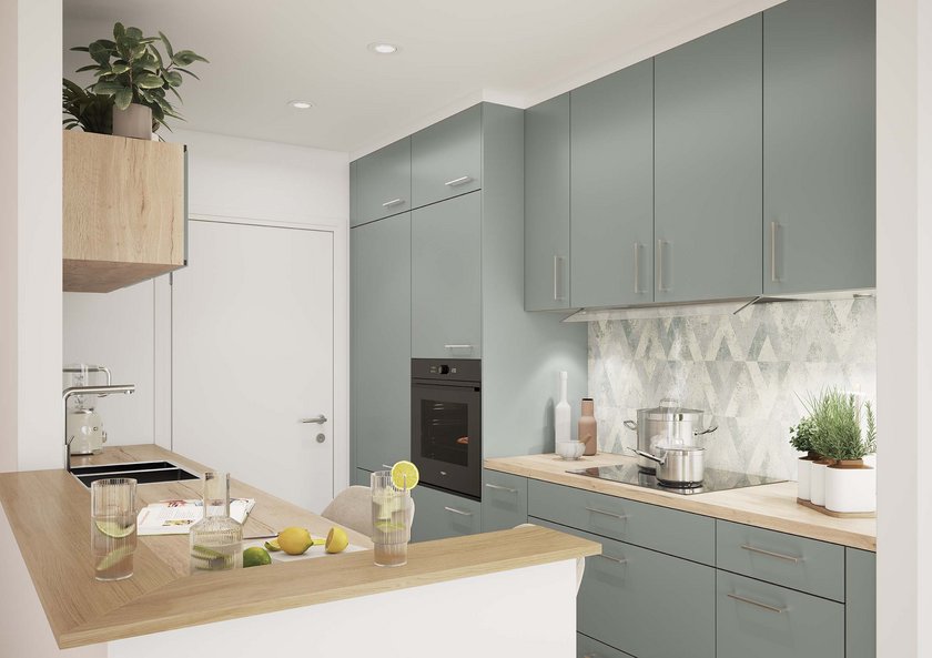 Un projet de cuisine dépend aussi du budget qu’on y consacre. « Le budget oriente beaucoup de choix », précise Jean-Emmanuel. « Notre objectif n’est jamais de faire dépenser plus, mais de travailler intelligemment dans le cadre fixé. » Cela permet de distinguer les solutions plus standards, qui couvrent déjà une grande partie des besoins, des modèles plus largement personnalisables. A l’image des deux cuisines modèles conçus par Jean-Emmanuel, Volga et Nizza Mat : « Volga, par exemple, associe une façade bleu profond à un plan de travail effet bois clair. Ce modèle abordable séduit par son équilibre et sa douceur visuelle crée une atmosphère chaleureuse et bien optimisée. Nizza Mat mise sur l’élégance haut de gamme. Sa façade en verre crystal mat, d’une grande résistance, et son plan de travail en céramique donnent à la pièce un cachet indéniable. Une table en décor bois vient réchauffer l’ensemble, pour un rendu aussi sophistiqué que convivial ».