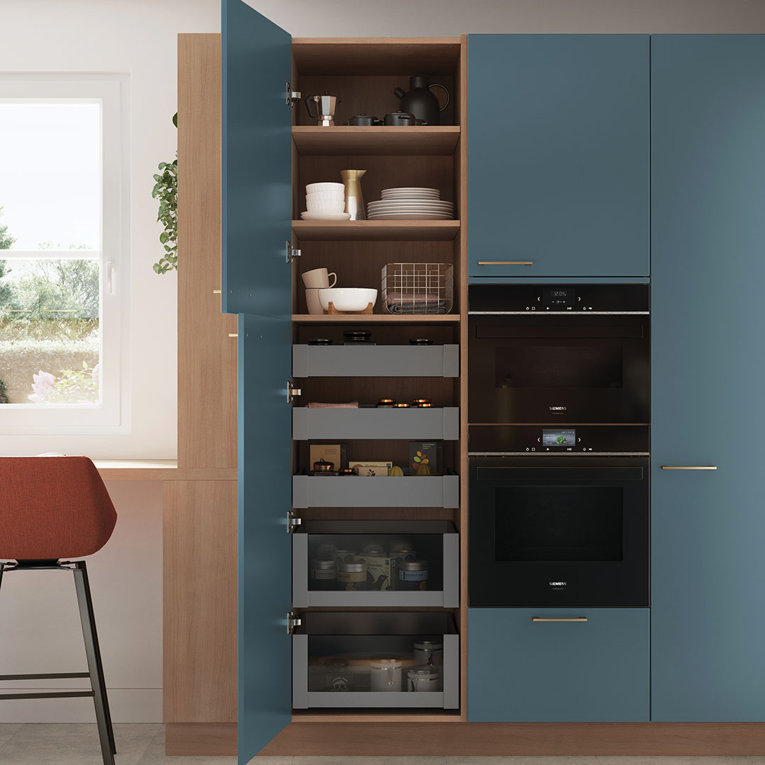 Optimisez l’intérieur de vos armoires en combinant étagères et tiroirs. Tous vos aliments et ustensiles sont rangés astucieusement pour être à portée de main lorsque vous cuisinez.