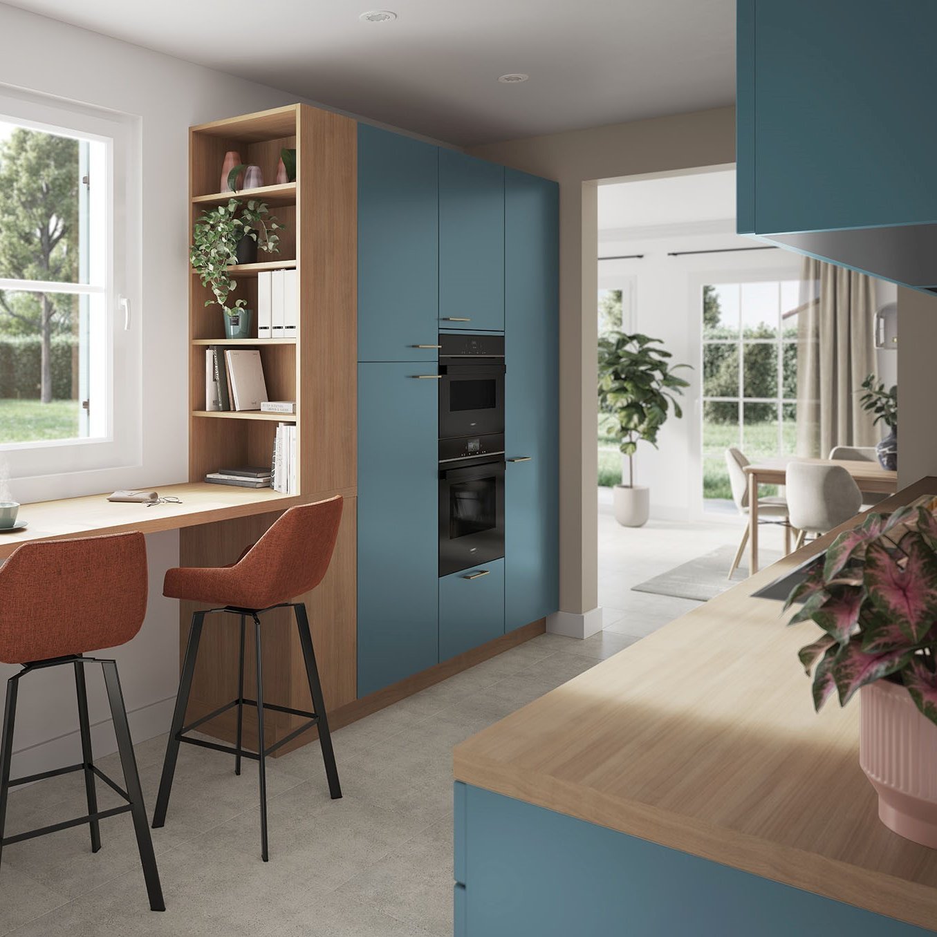 La profondeur de la façade bleue fjord combinée à la douceur du décor bois clair apportent une harmonie à la cuisine Colorado. Un résultat chaleureux et tendance.