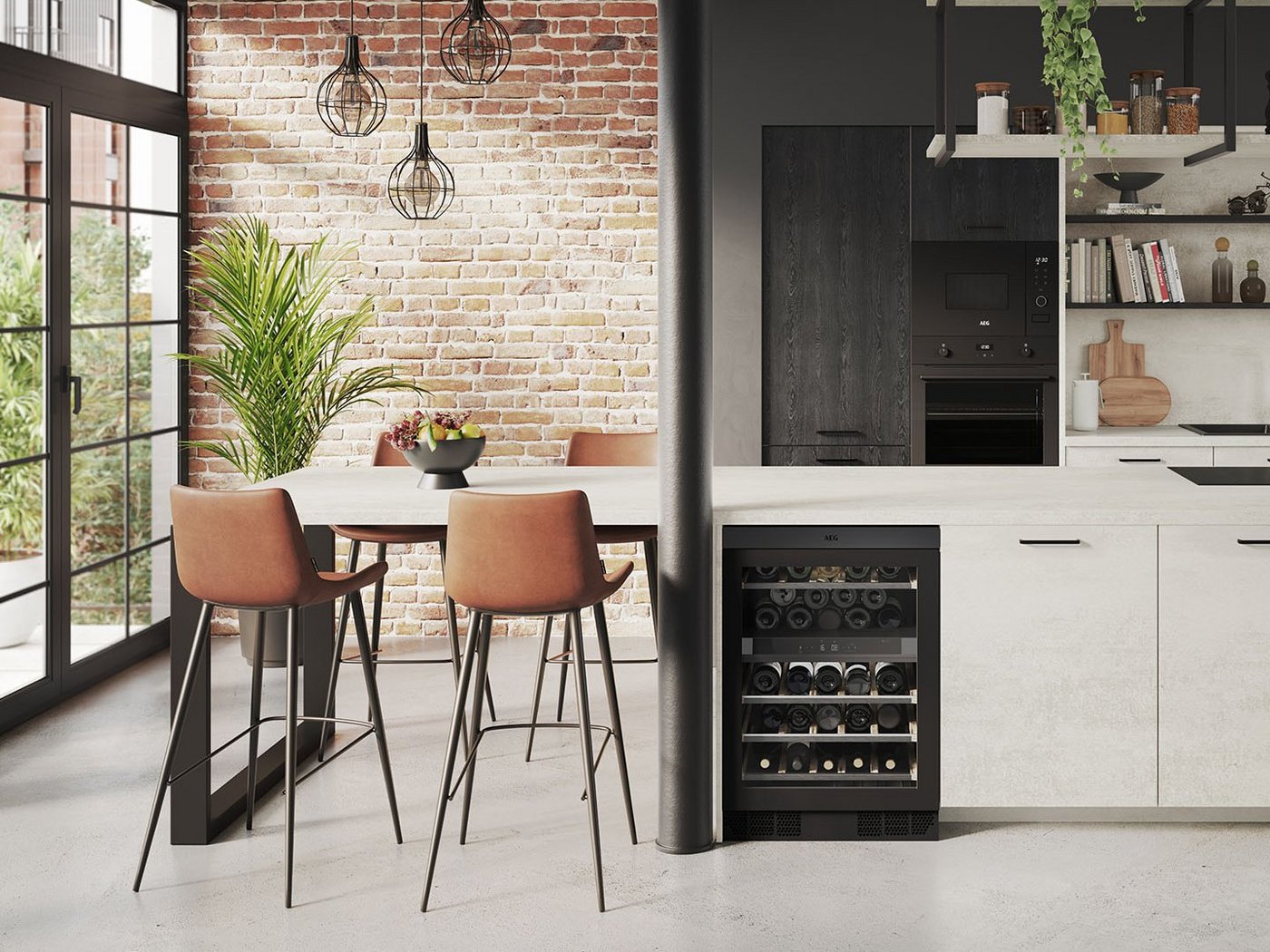Si votre pièce a une contrainte technique, nous veillons à toujours trouver une solution pour que votre cuisine s’adapte à votre espace. Dans cet espace-ci, le plan de travail de cet îlot a été adapté pour épouser la colonne.