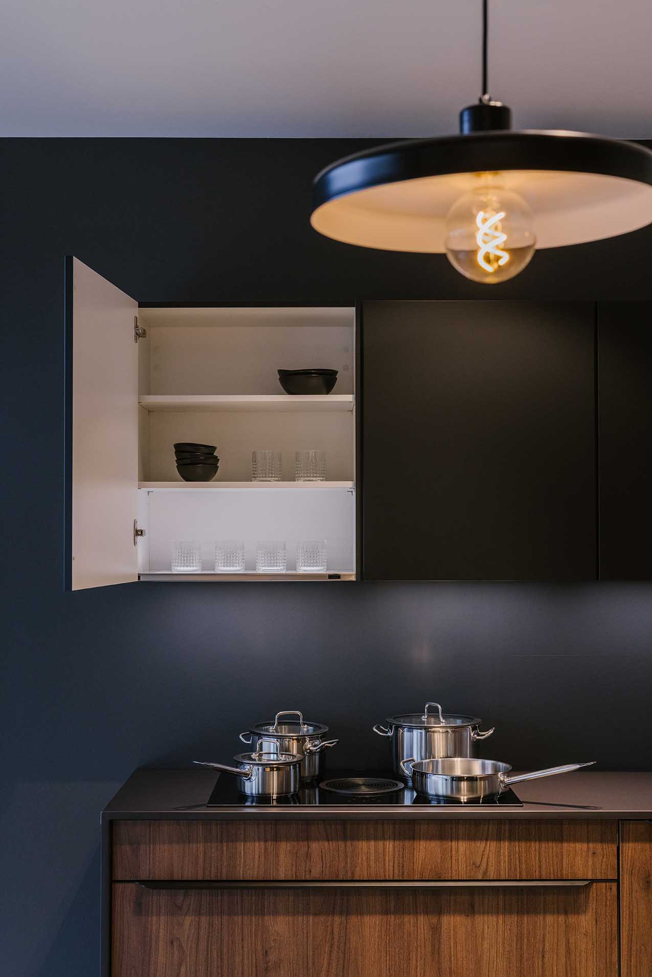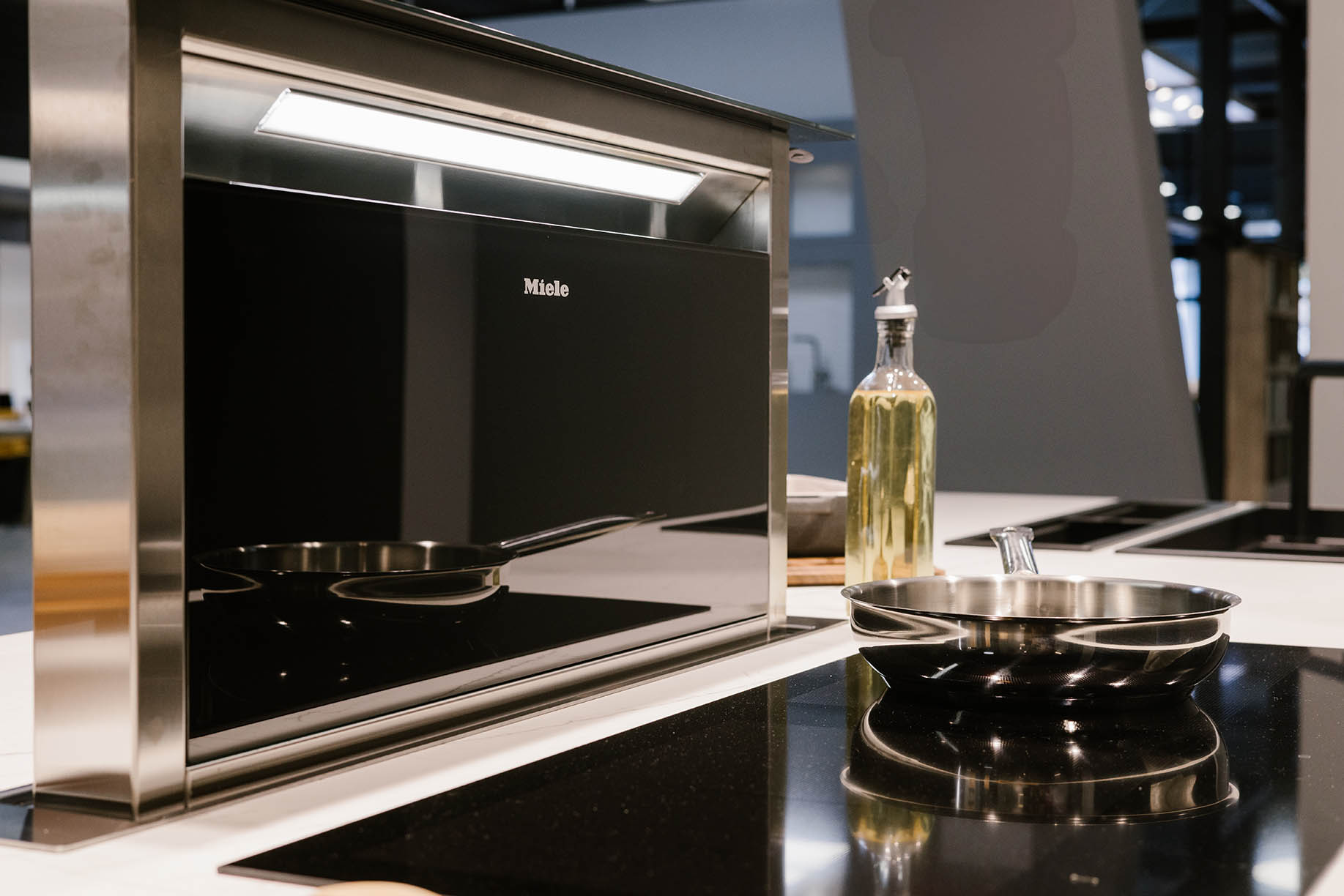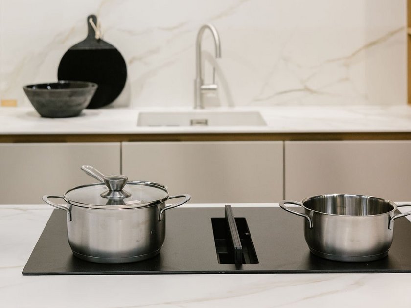 Certaines tables de cuisson sont dotées d’une hotte intégrée directement dans le plan de travail. Cette solution design libère l’espace au-dessus de votre table et assure une aspiration efficace à la source. L’air peut être purifié et évacué via la plinthe, ou recyclé selon vos préférences.