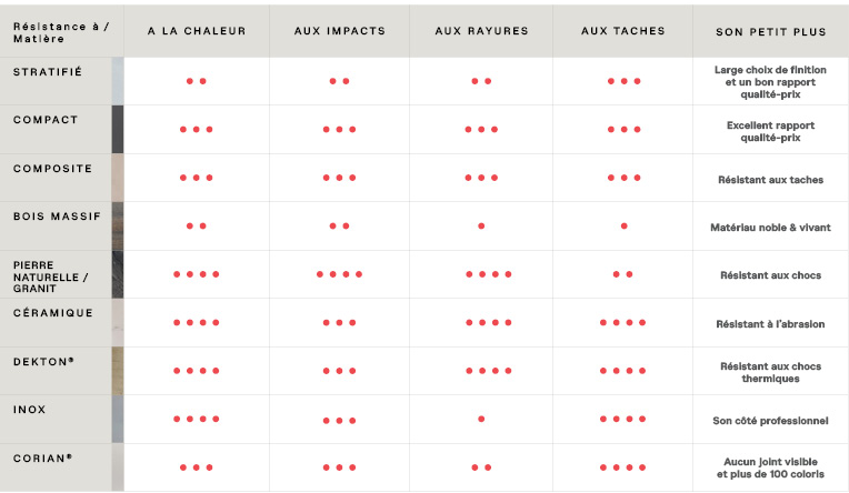 Le plus qualitatif des plans de travail. Il est résistant aux chocs, à l’usure et à la chaleur.