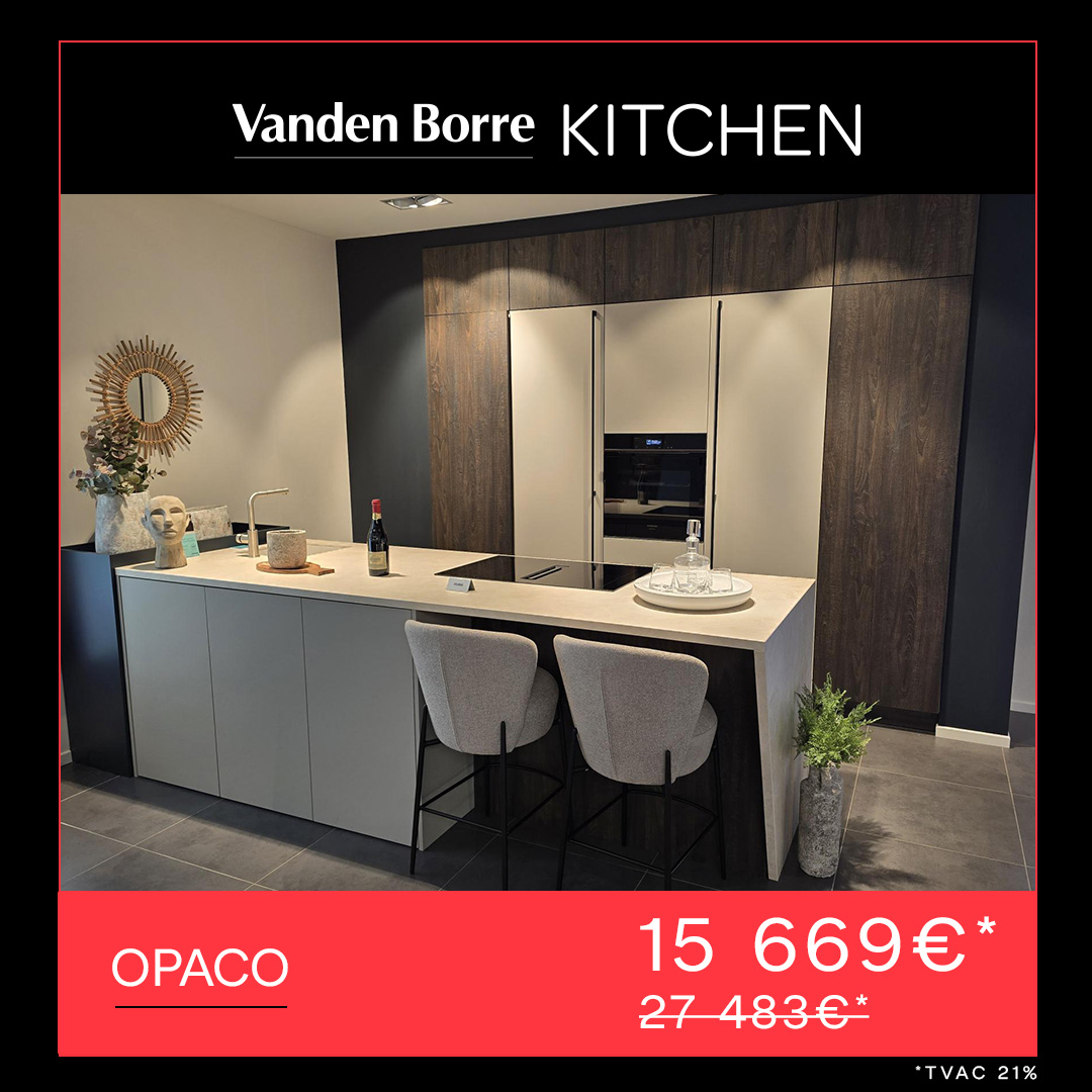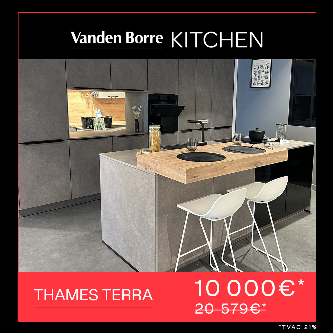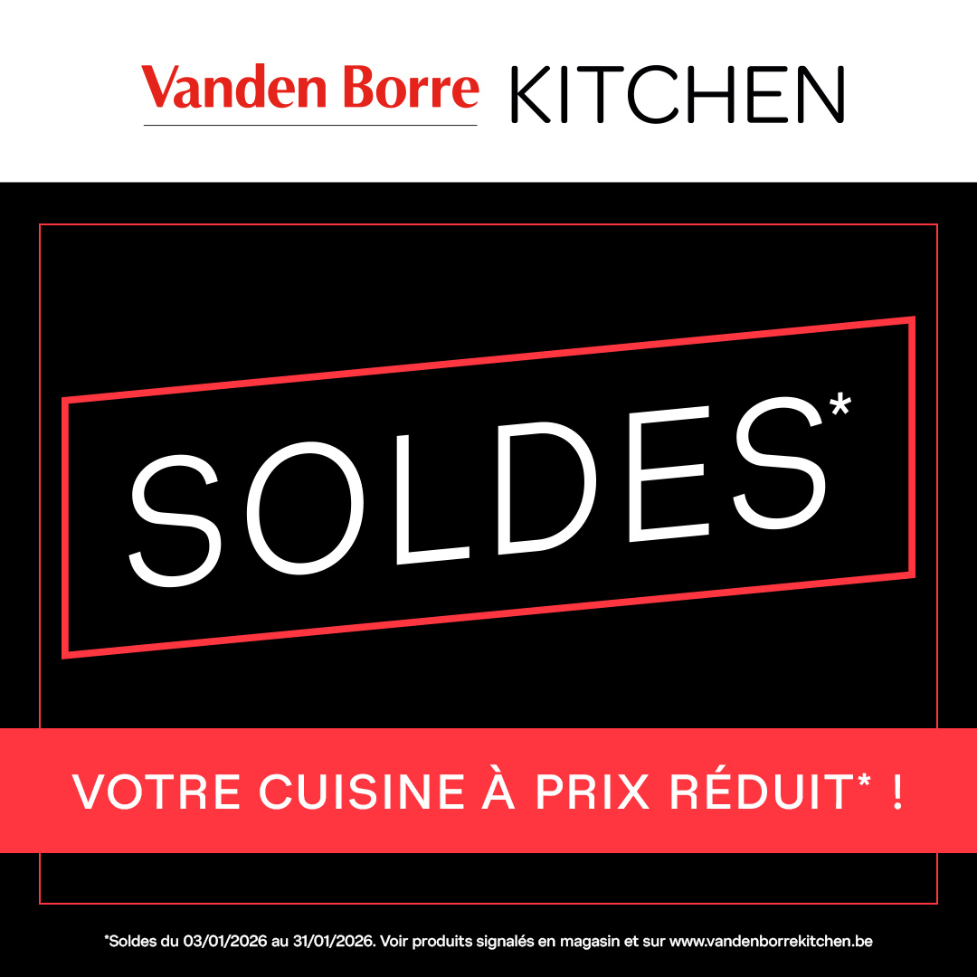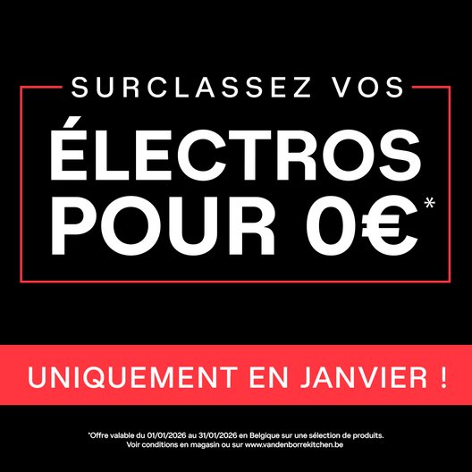*Offre « Surclassez vos électros pour 0€ » valable en Belgique du 01/01/2026 au 31/01/2026 avec obligation d’achat d’une cuisine équipée d’une valeur min. de 4000€ HT/TVAC (meubles et électroménagers, hors cuisine d’exposition) livrée et posée, avant le 31/07/2026, par le magasin Vanden Borre Kitchen auprès duquel l’achat est effectué. Offre valable sur une sélection d’électroménagers présentée par votre Expert Cuisine en magasin (table de cuisson, hotte, four, réfrigérateur et lave-vaisselle).