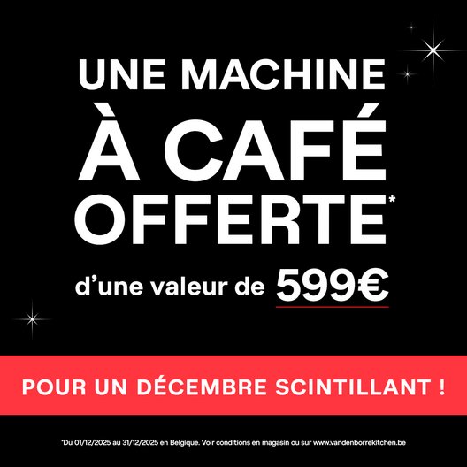 *Du 01/12/2025 au 31/12/2025, votre magasin Vanden Borre Kitchen vous offre une machine à café Smeg d'une valeur de 599€ pour tout achat d’une cuisine équipée d’une valeur min. de 4000€ HT (meubles et électroménagers, hors cuisine d’exposition) livrée et posée, avant le 31/07/2026, par le magasin Vanden Borre Kitchen auprès duquel l’achat est effectué. Réservée aux particuliers.