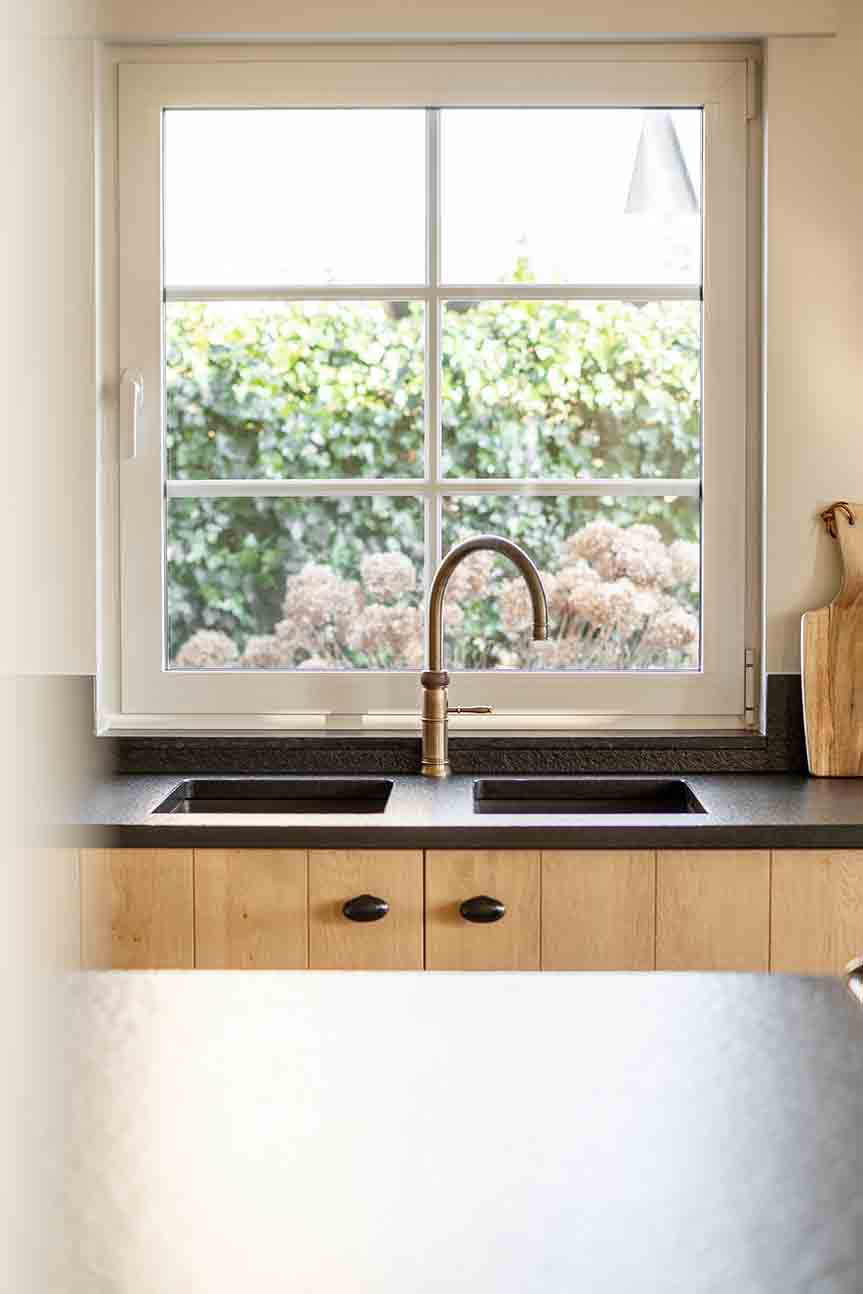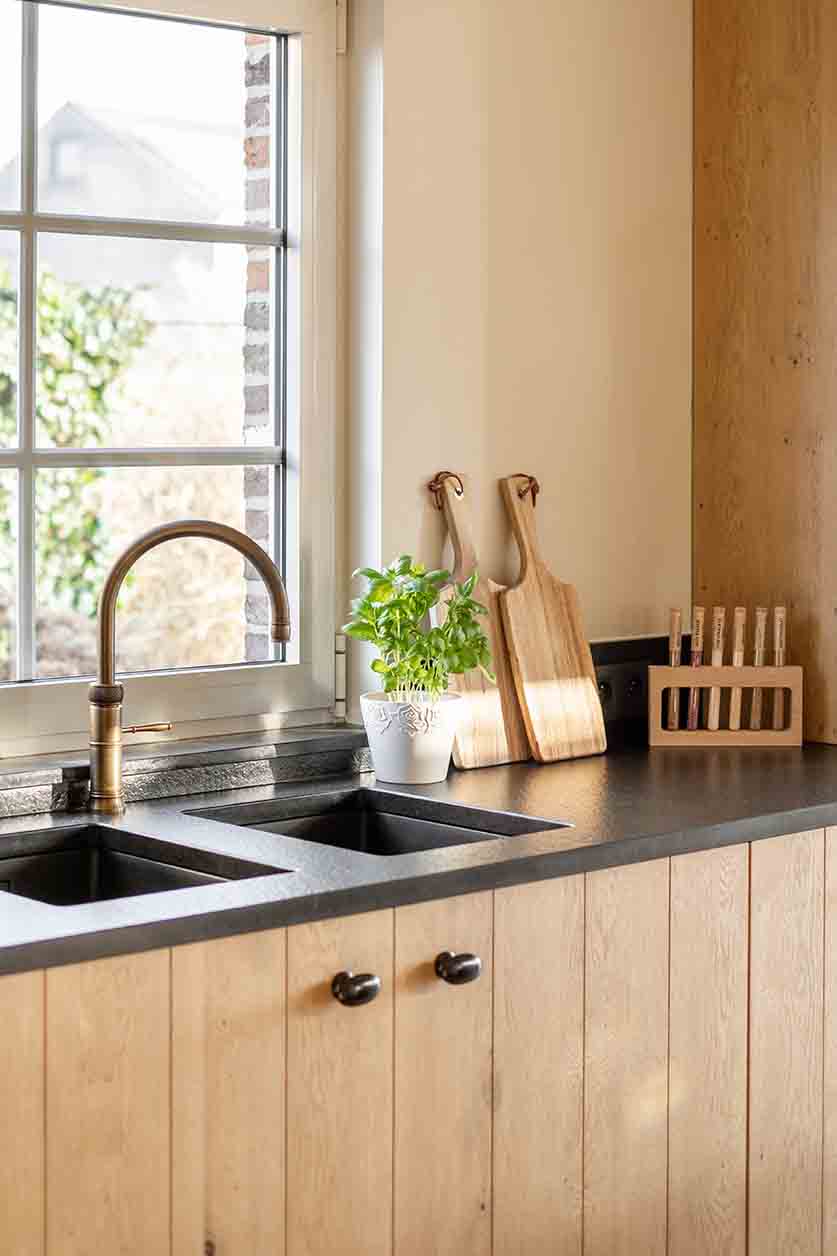 Cuisine rustique en Chêne Natur Merino avec plan de travail en Granit Noir Zimbabwe, meuble sur plan avec façade vitrée, cuisinière et mitigeur Quooker finition laiton