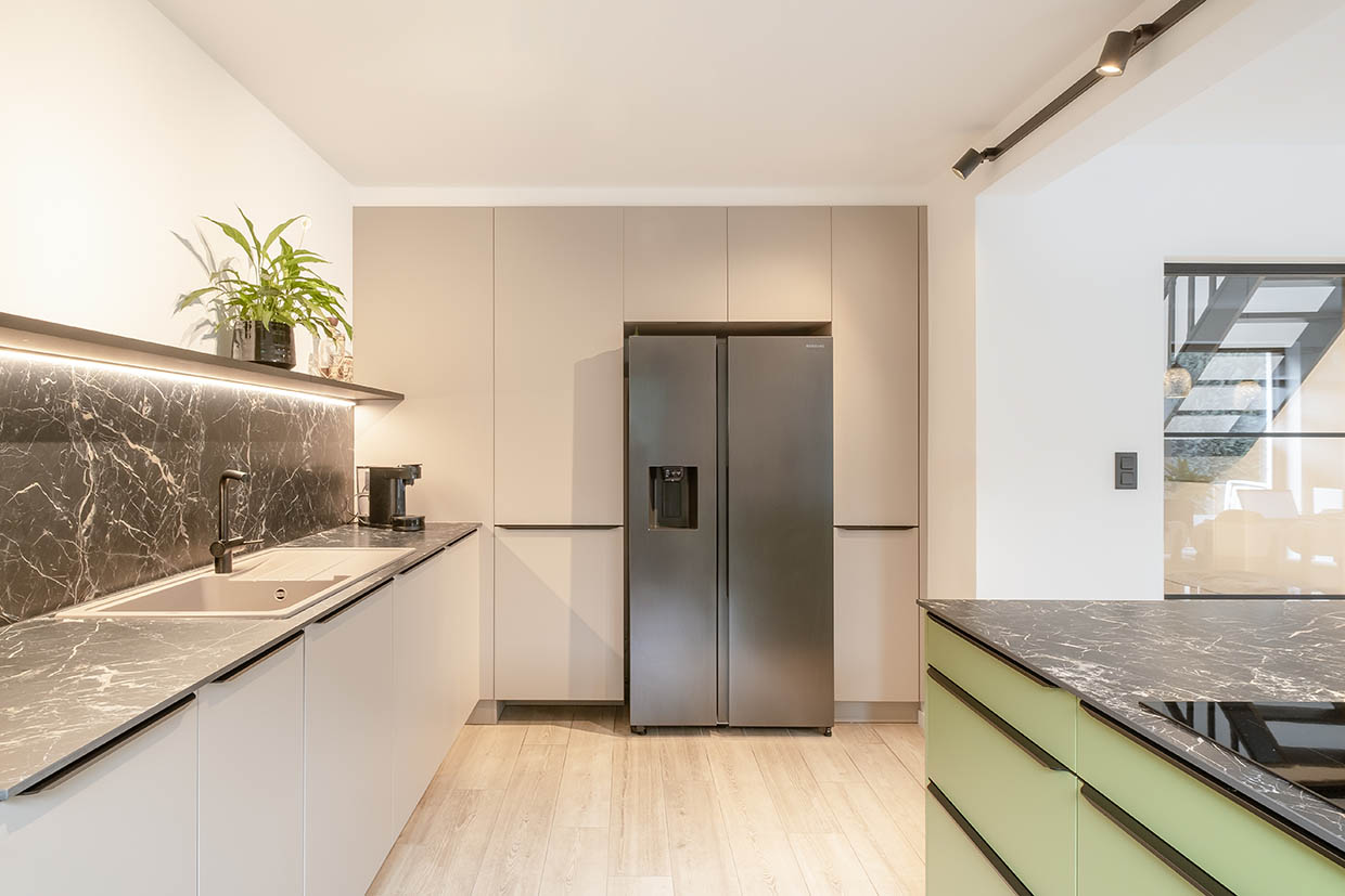 Cuisine moderne avec îlot en Colorado vert & Lima gris sable avec plan de travail en céramique finition Saint Laurent Satin, des meubles XL et sans poignées