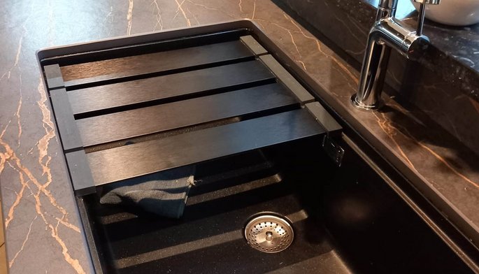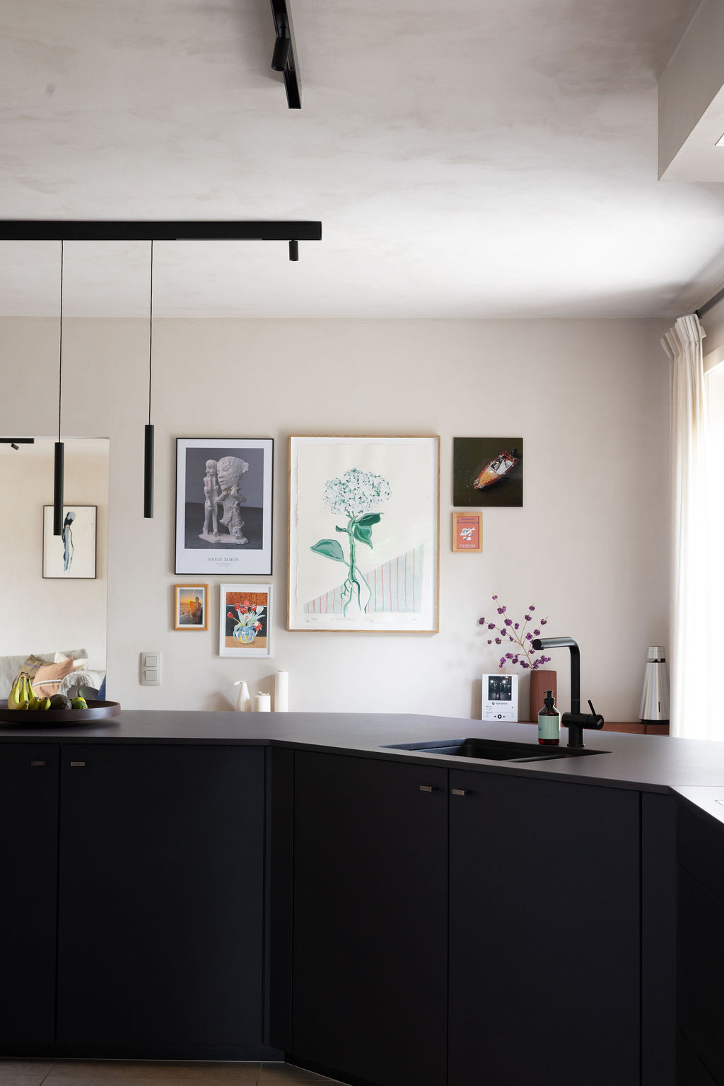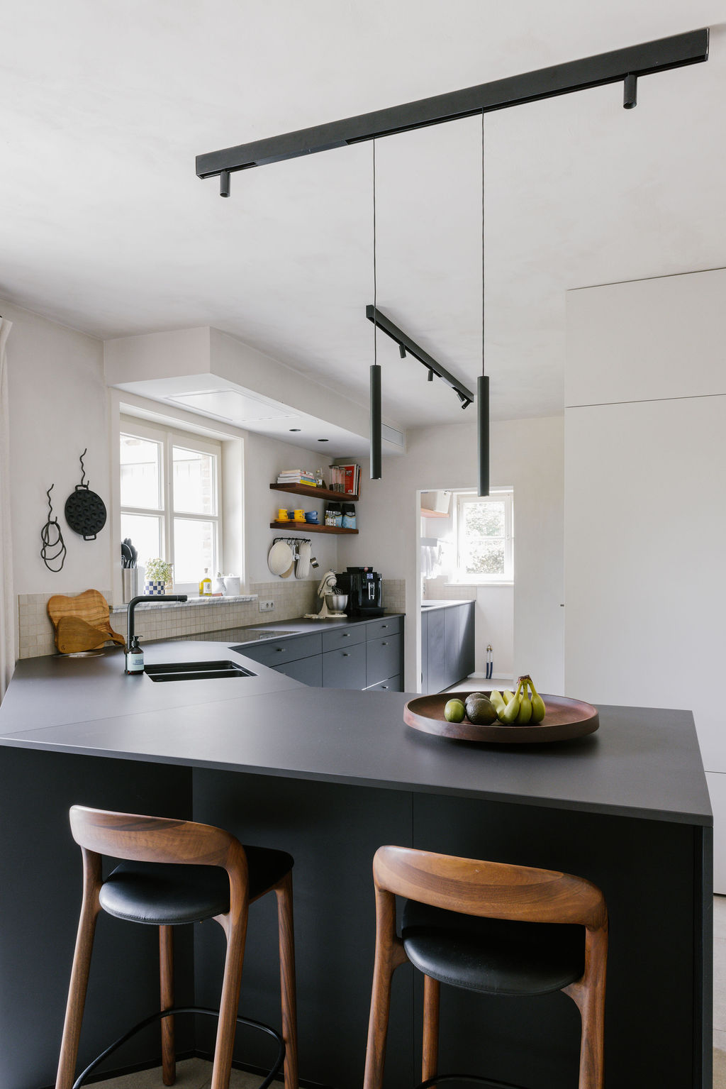 Cuisine design en U mêlant façades Volga Noir laqué et effet bois, plan de travail en Dekton, équipée d’un évier noir et d’un mitigeur inox pour une ligne sobre et maîtrisée.