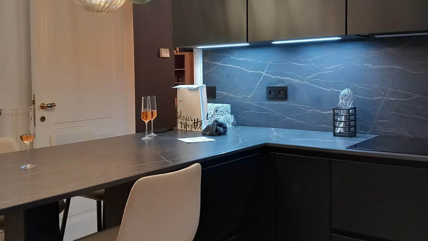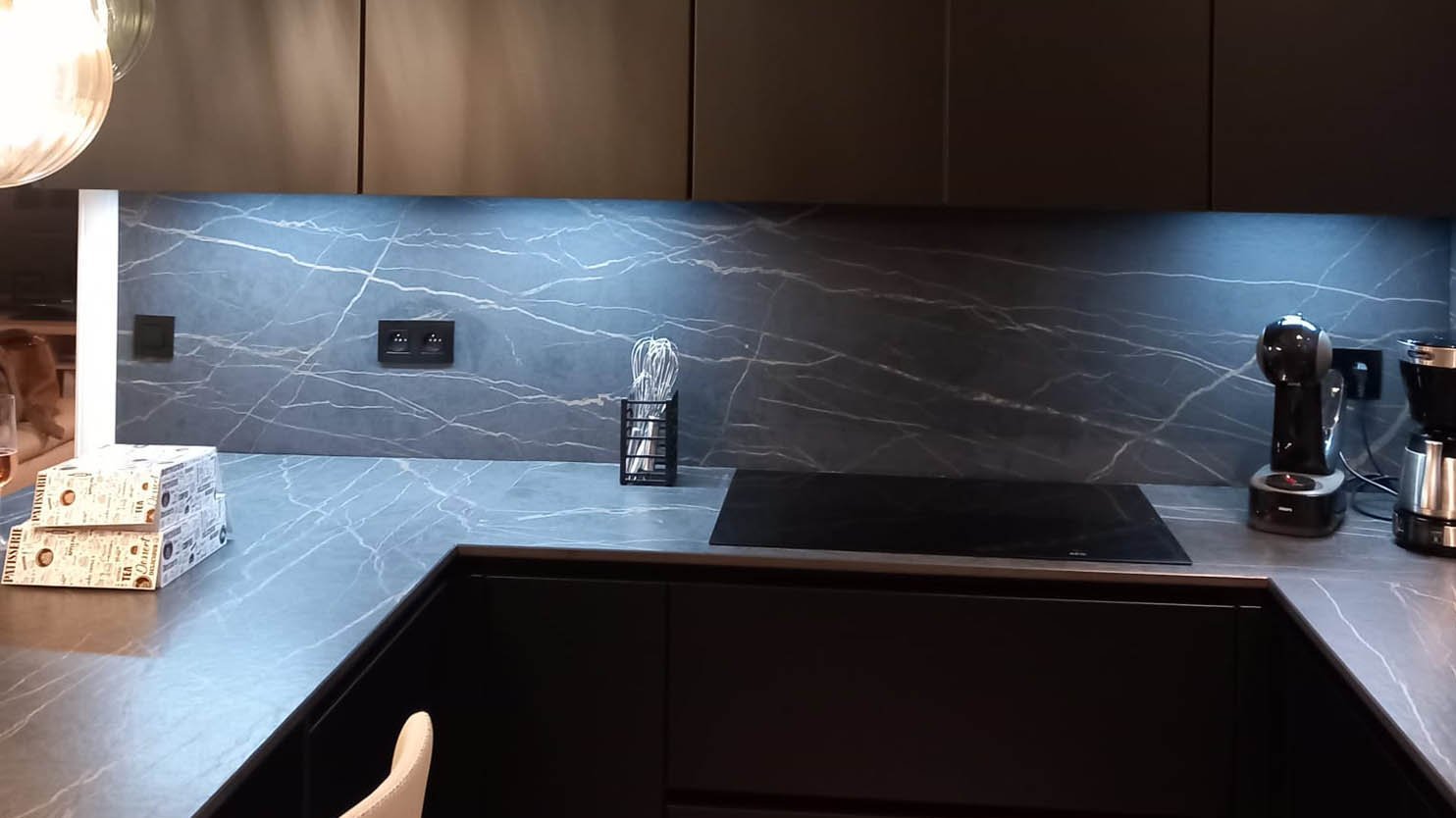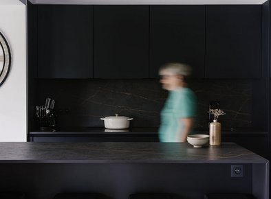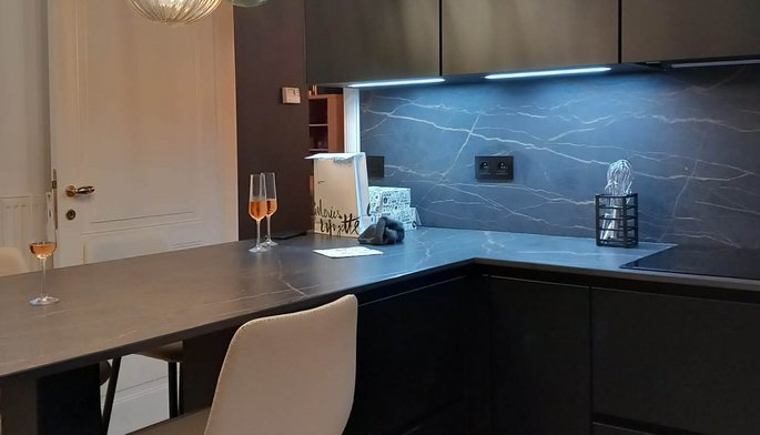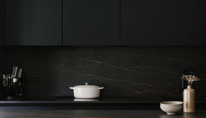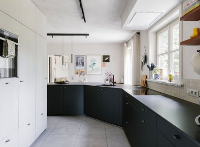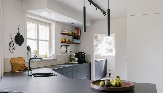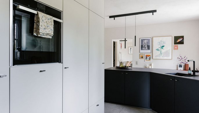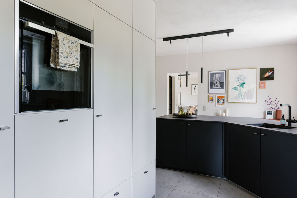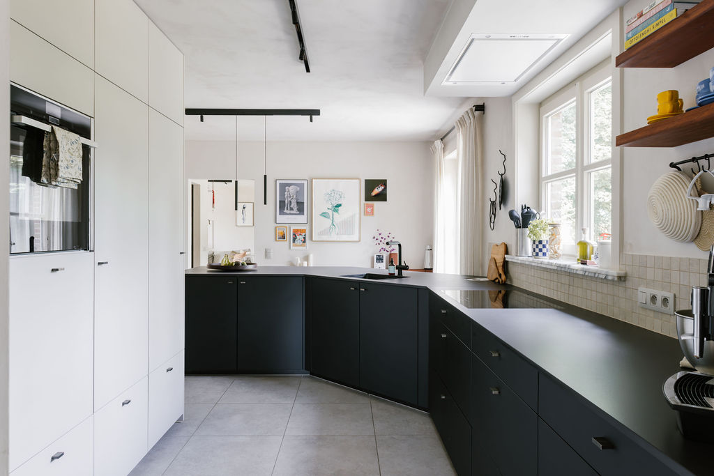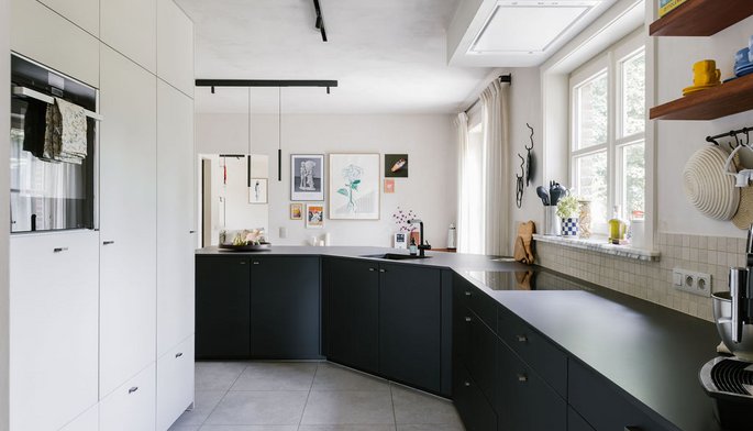 Cuisine moderne parallèle noire et blanche avec plan de travail en dekton®
