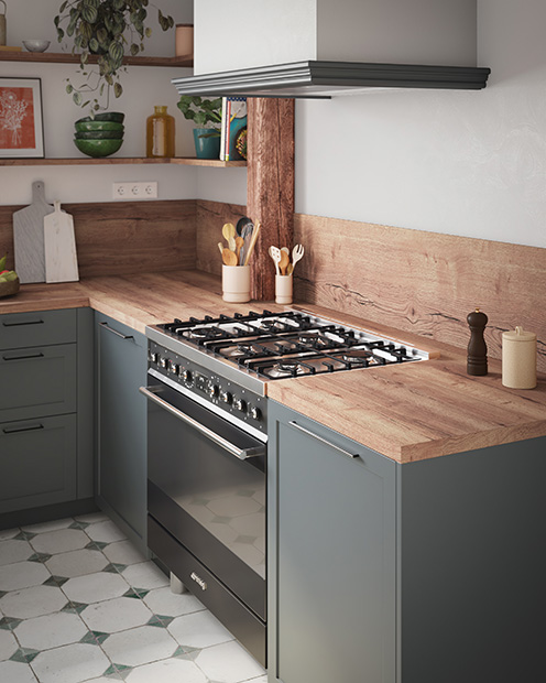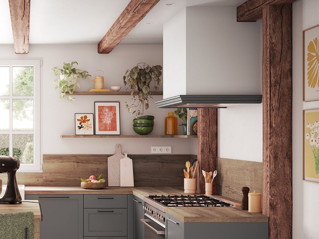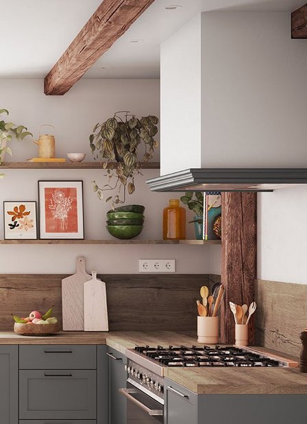 Onze Donau-keuken herinterpreteert de landelijke stijl op subtiele wijze. De kaderfronten in leigrijs passen perfect bij het karakter van een interieur met zichtbare balken, terwijl het werkblad met houtlook een warme toets toevoegt. Het kookeiland nodigt uit tot gezellig tafelen of koken. De vitrinekast en open legplanken zorgen voor een lichte uitstraling, terwijl elk detail is afgestemd op de ruimte en de sfeer van de keuken versterkt.