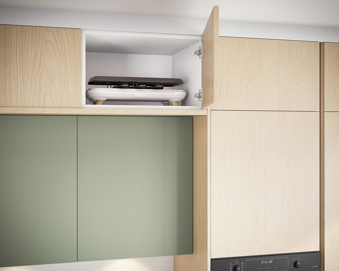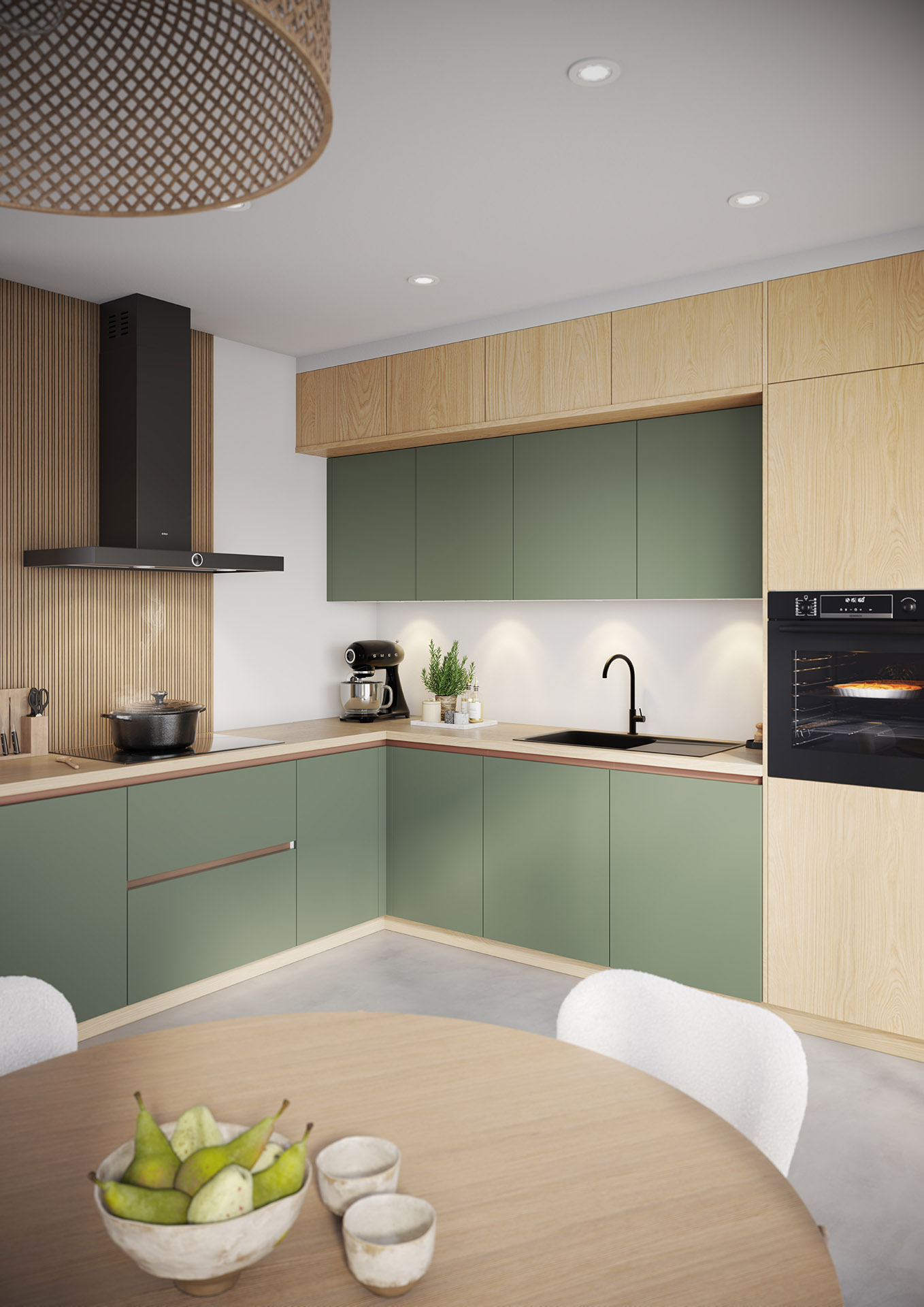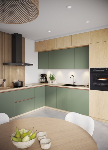 Onze Lys Eiken Como-keuken bekoort met haar japandi-stijl: minimalistisch en toch warm. Het lichte hout combineert perfect met olijfgroen en creëert een zachte, natuurlijke sfeer. De greeploze afwerking met bronzen profiel benadrukt de strakke lijnen, terwijl de bovenkasten met dubbele diepte spelen met volumes. Een doordacht design, ontworpen voor comfort en efficiëntie.