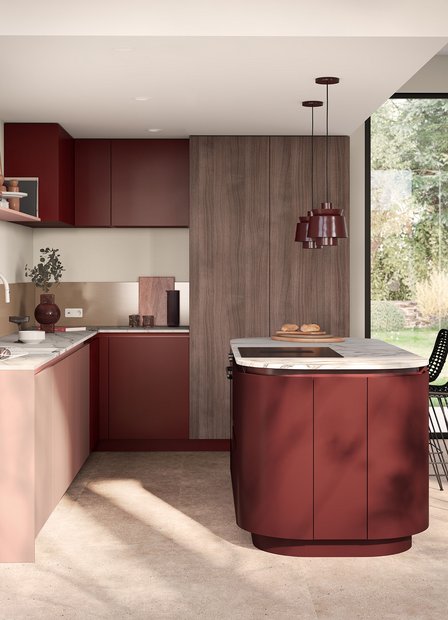De Mono Rosa-keuken valt op door zijn gedurfde ontwerp, waarin warme roze tinten samen met hout een gezellige en karaktervolle sfeer creëren. Het marmeren decor werkblad en de bronzen achterwand geven een extra vleugje elegantie, terwijl het afgeronde kookeiland zachtheid en moderne lijnen toevoegt aan de ruimte.
