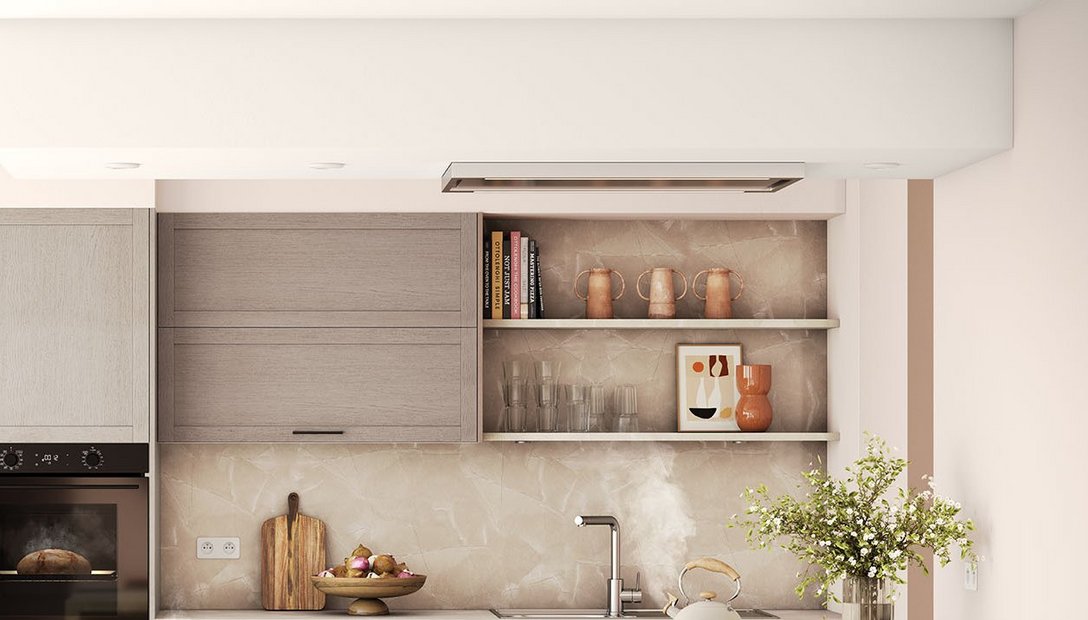Onze Telaio-keuken combineert een front met kader in macchiatokleurig houtdecor met een werkblad in grijs marmerdecor. Een zacht en authentiek resultaat.