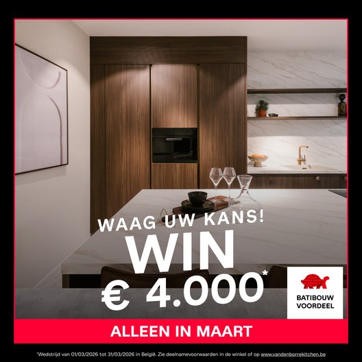 *Spel geldig in België van 01/03/2026 tot 31/03/2026 met aankoopverplichting van een inbouwkeuken met een minimale waarde van € 4.000 excl. BTW (meubilair en elektro, uitgezonderd showroomkeukens) geleverd en geïnstalleerd, vóór 31/12/2026, door de Vanden Borre Kitchen winkel waar de aankoop wordt gedaan. Prijs: 1 waardebon ter waarde van € 4.000 aangeboden in de vorm van een korting per winkel. De Prijs kan in geen geval worden terugbetaald in cash, omgewisseld of geheel of gedeeltelijk worden ingeruild in natura of in cash. Trekking uiterlijk op 15/04/2026. Spel gereserveerd voor particulieren. Zie de volledige spelregels in de winkel of op www.vandenborrekitchen.be en het deelnameformulier op www.vandenborrekitchen.be/wedstrijd-maart/reglement