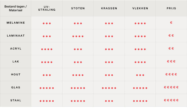 Naast een assortiment modellen is er ook een reeks frontmaterialen beschikbaar voor alle budgetten en projecten: laminaat, gelakt, glas, echt beton of betoneffect, leisteeneffect, echt hout of houteffect.