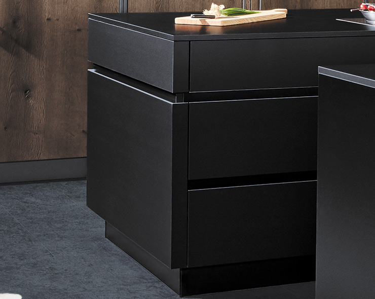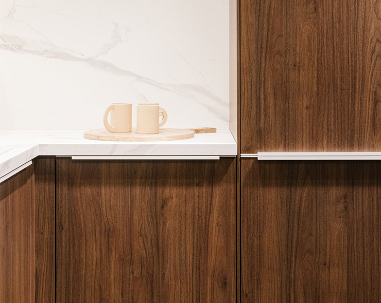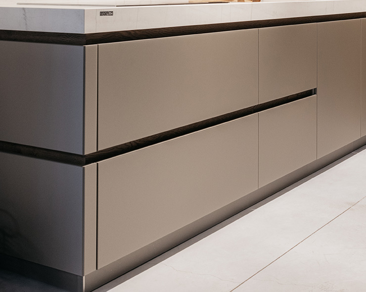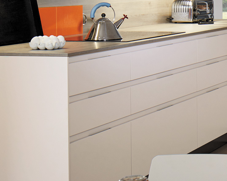 Wij zijn de specialisten van de keuken zonder handgrepen.We beschikken over tal van oplossingen die verder gaan dan de gangbare marktstandaarden. Keukens zonder handgrepen bieden heel wat mogelijkheden voor personalisering, ongeacht het aantal lades, uitschuifelementen of profielen zonder handgrepen. Onze collectie van laminaat of echt hout biedt voor onze modellen zonder handgrepen een hele waaier aan afwerkingen en kleuren om uw keuken tot in het kleinste detail te verfraaien.